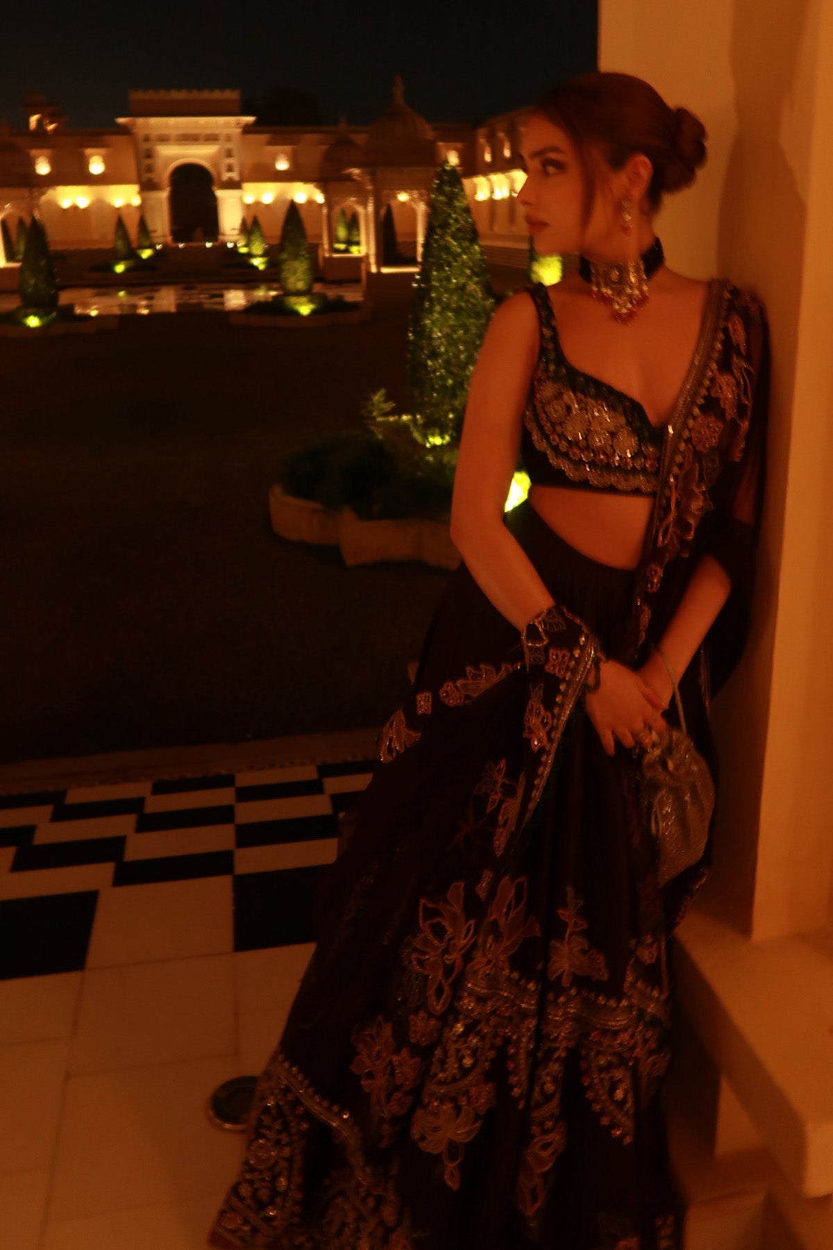 Kota Tissue Embroidered Blouse And Lehenga Paired With Net Embroidered Dupatta
