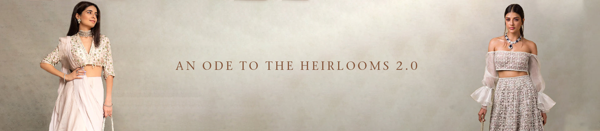 An Ode to the Heirlooms is an inspiration from age-old, family heirloom pieces - Kashmiri pashmina shawls, rare Basra pearls, inherited vintage jewels and handwoven silk sarees.