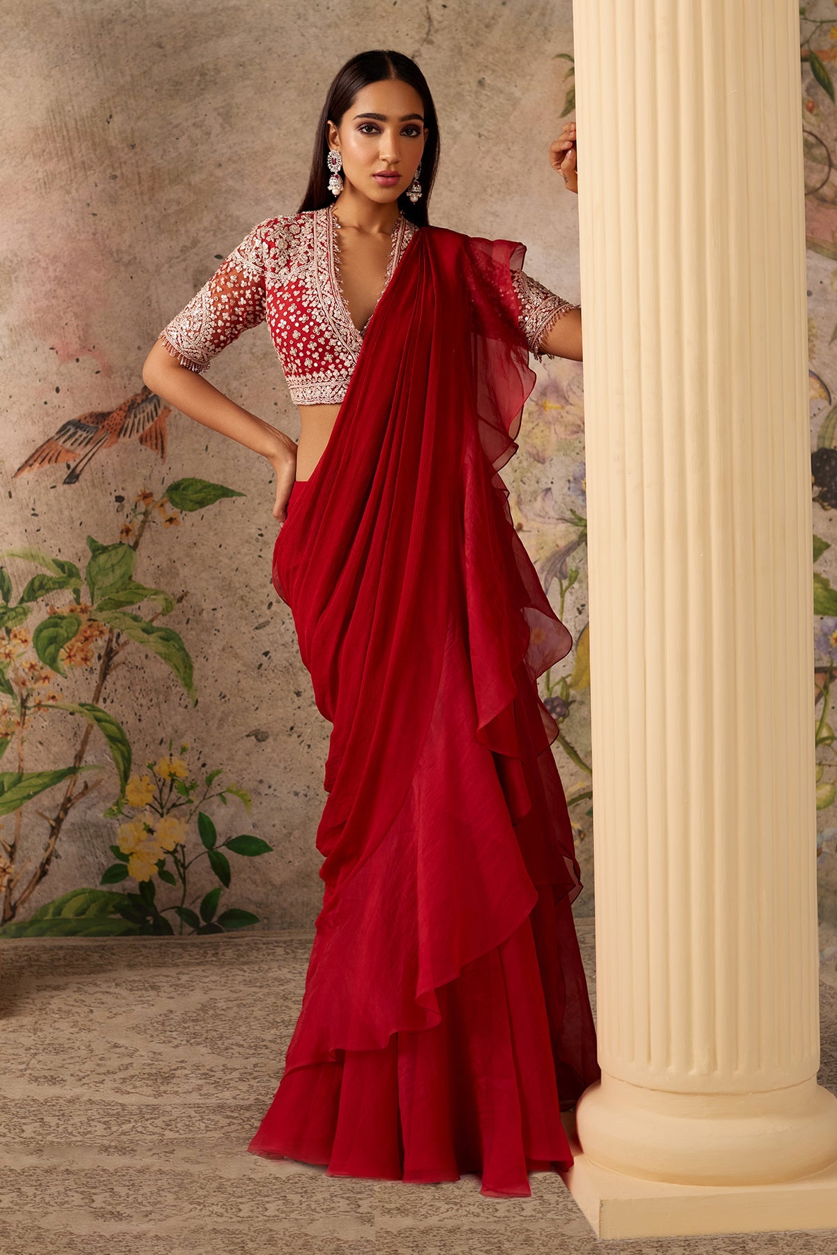 Indulge in elegance with our exquisite saree featuring a heavily net embroidered blouse paired with a chiffon drape saree and organza ruffle. The blouse stands out with its dusky pink thread detailing and embellishments, adding a touch of sophistication to the ensemble. Perfect for special occasions and festive celebrations, this saree effortlessly combines traditional charm with modern flair. The meticulous craftsmanship and thoughtful design ensure a timeless look that captures attention. Elevate your style with this stunning saree, making a memorable statement at any event.