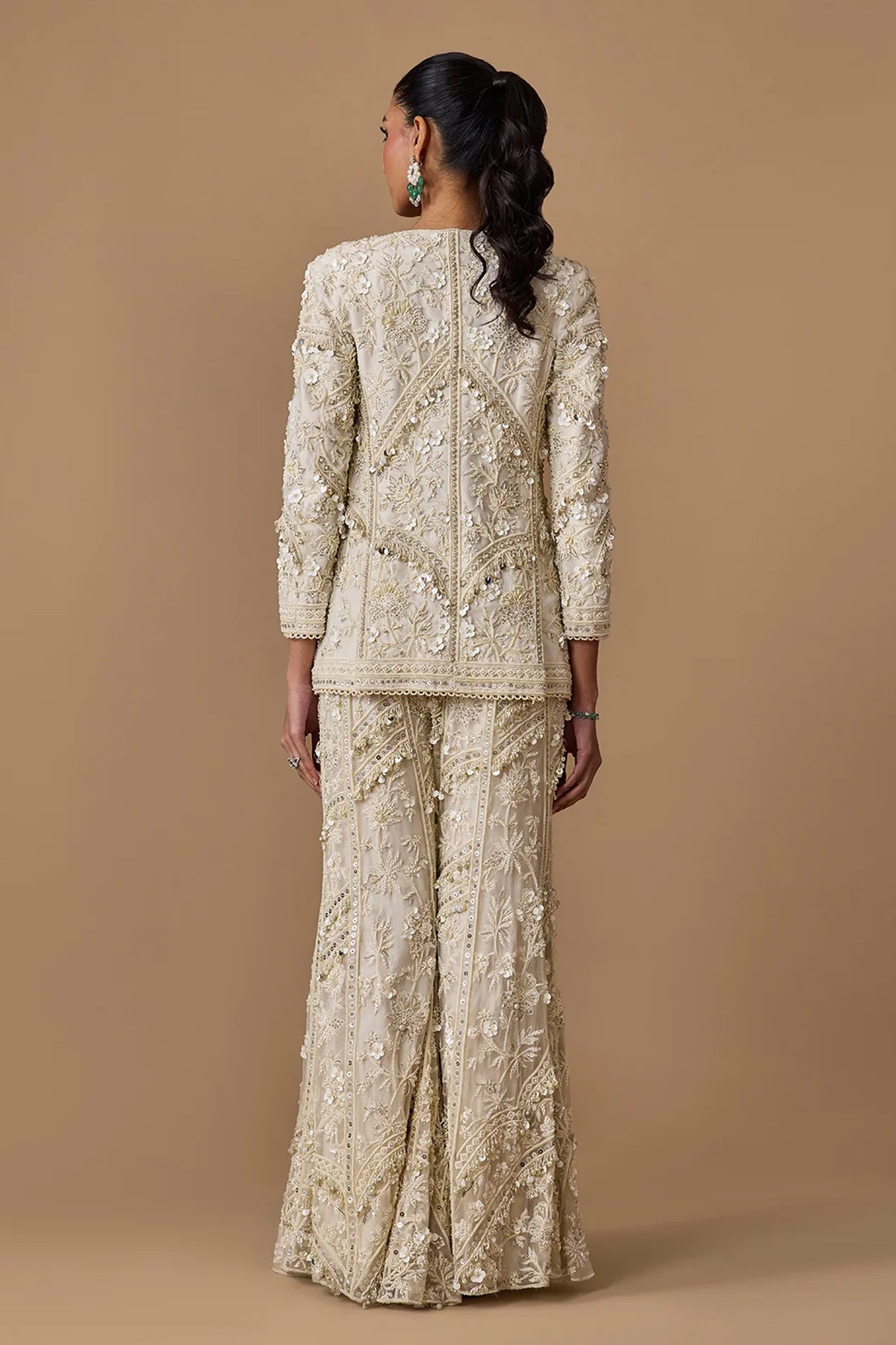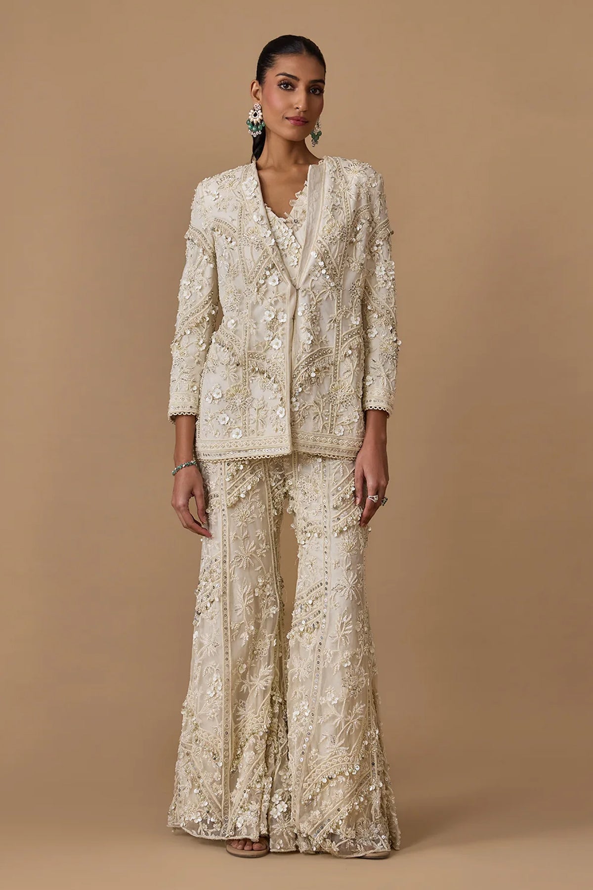 Step into the spotlight with our Ivory Heavily Embroidered Net Jacket, perfectly paired with Organza Embroidered Flared Pants and a captivating Organza Embroidered Bustier. This couture ensemble combines intricate detailing with timeless elegance, ensuring you're the epitome of style at any event. The versatile ivory hue, luxurious embroidery, and thoughtfully designed silhouette make it a go-to for special occasions. Elevate your fashion statement with this exquisite outfit, where every element is a testament to couture excellence. Shop now and embrace a new level of sophistication and charm.