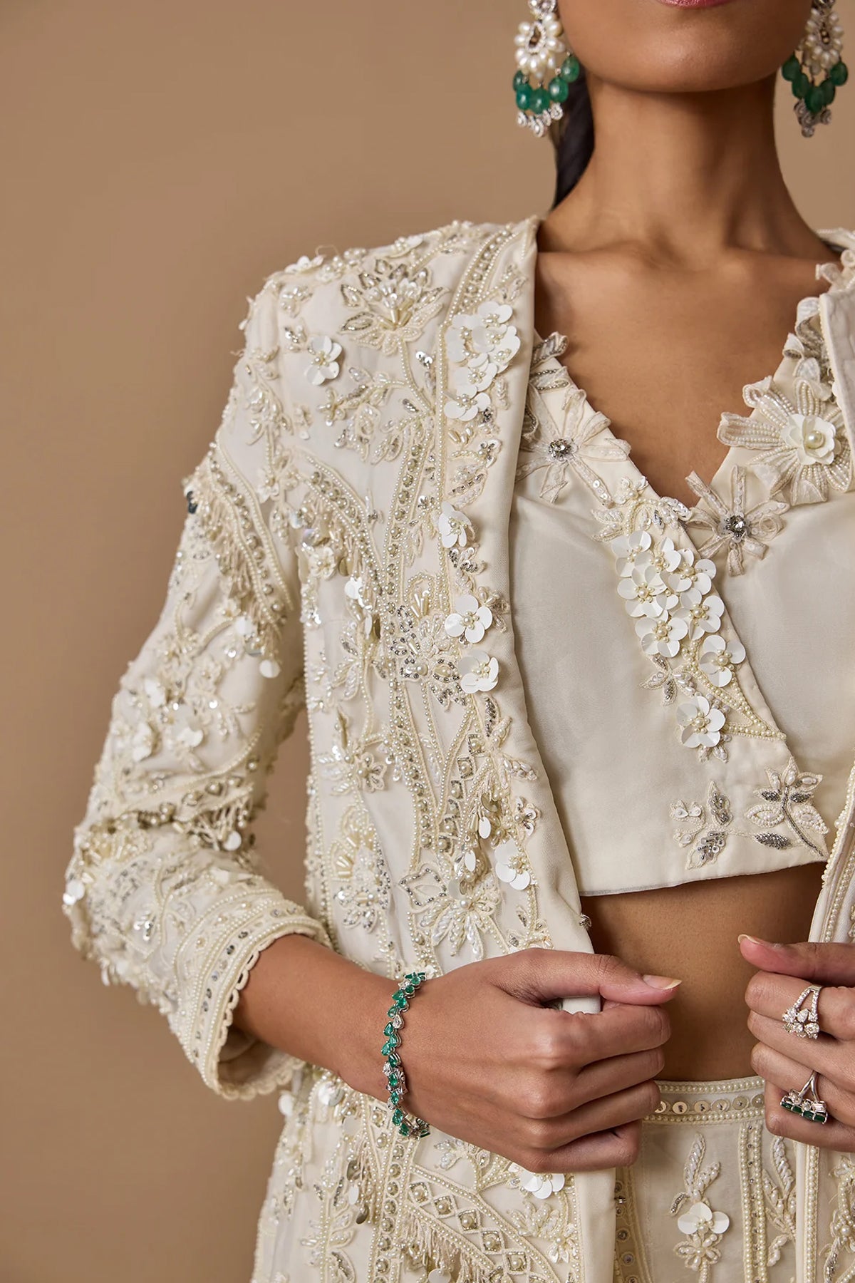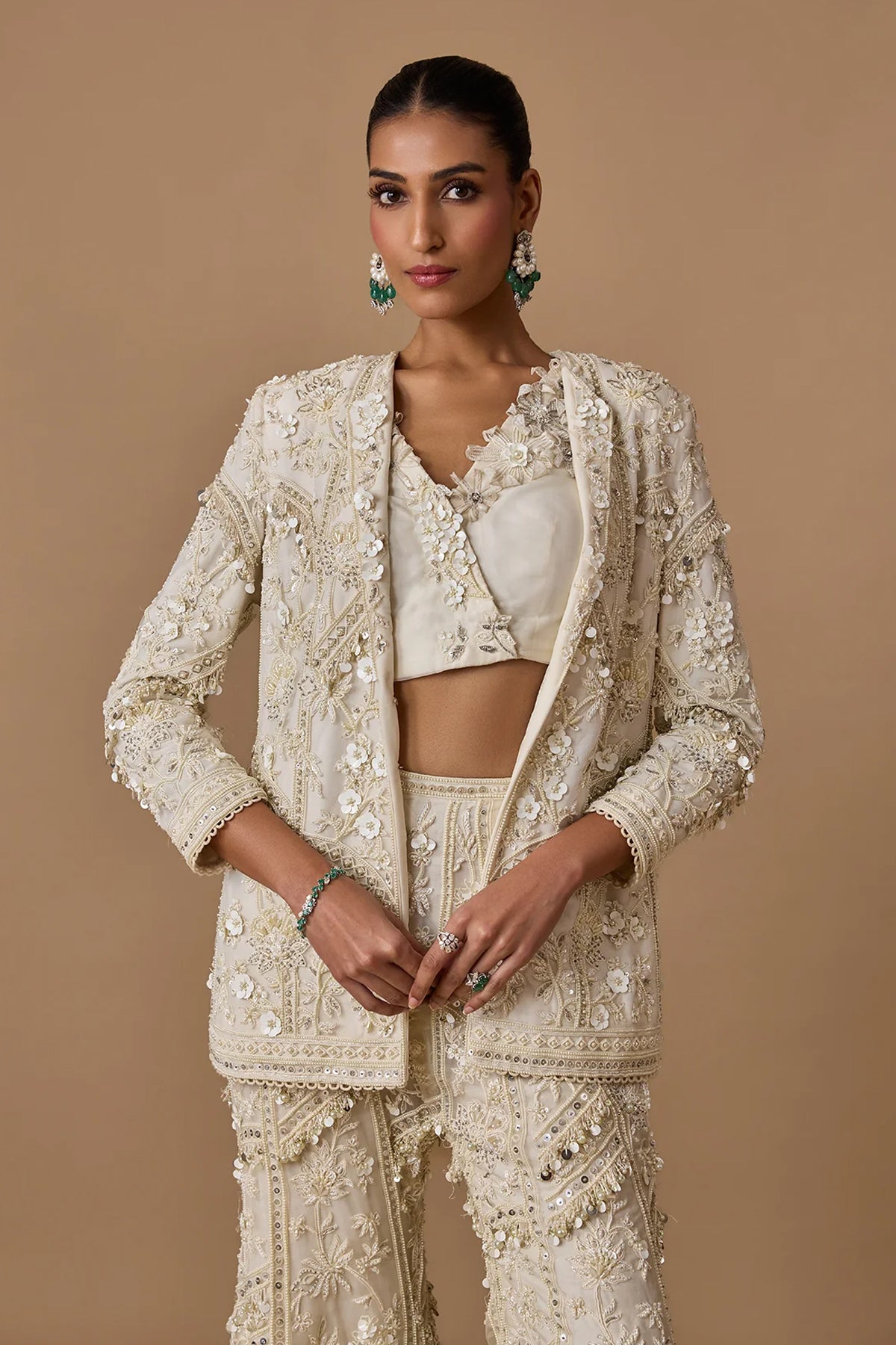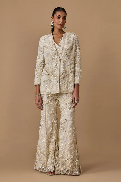 FABRIC DETAILS: Jacket: Net, Pants: Organza, Bustier: Organza