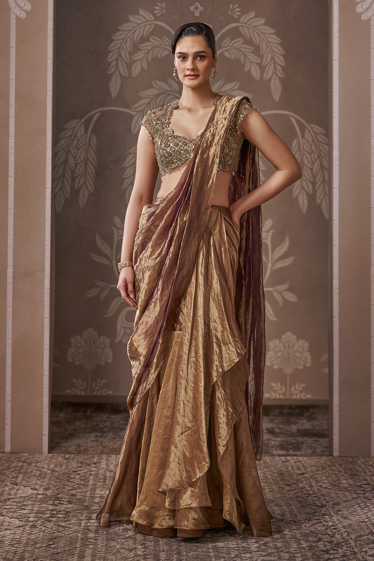 Tissue Embroidered Blouse With Tissue Draped Stitched Saree