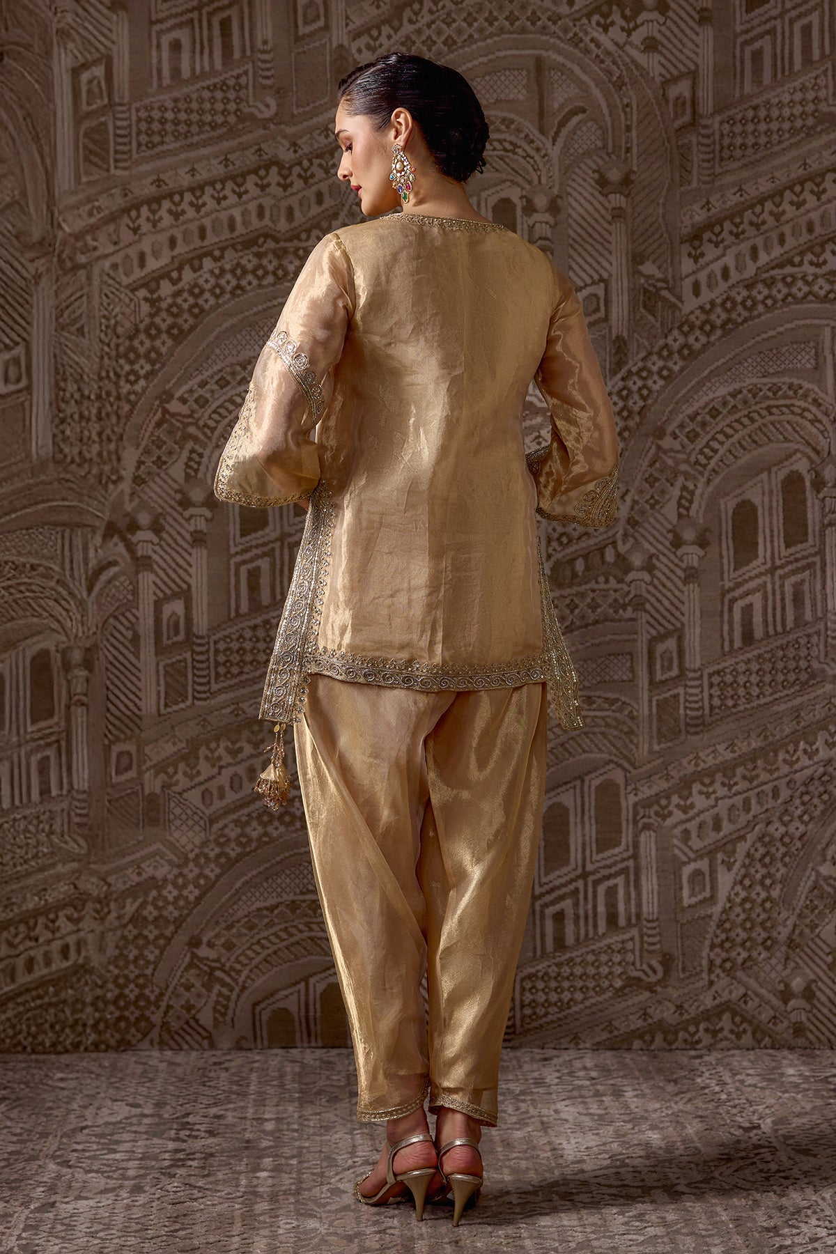 Deep Gold Tissue Embroidered Kurta And Salwar Paired With Crushed Tissue Embroidered Dupatta