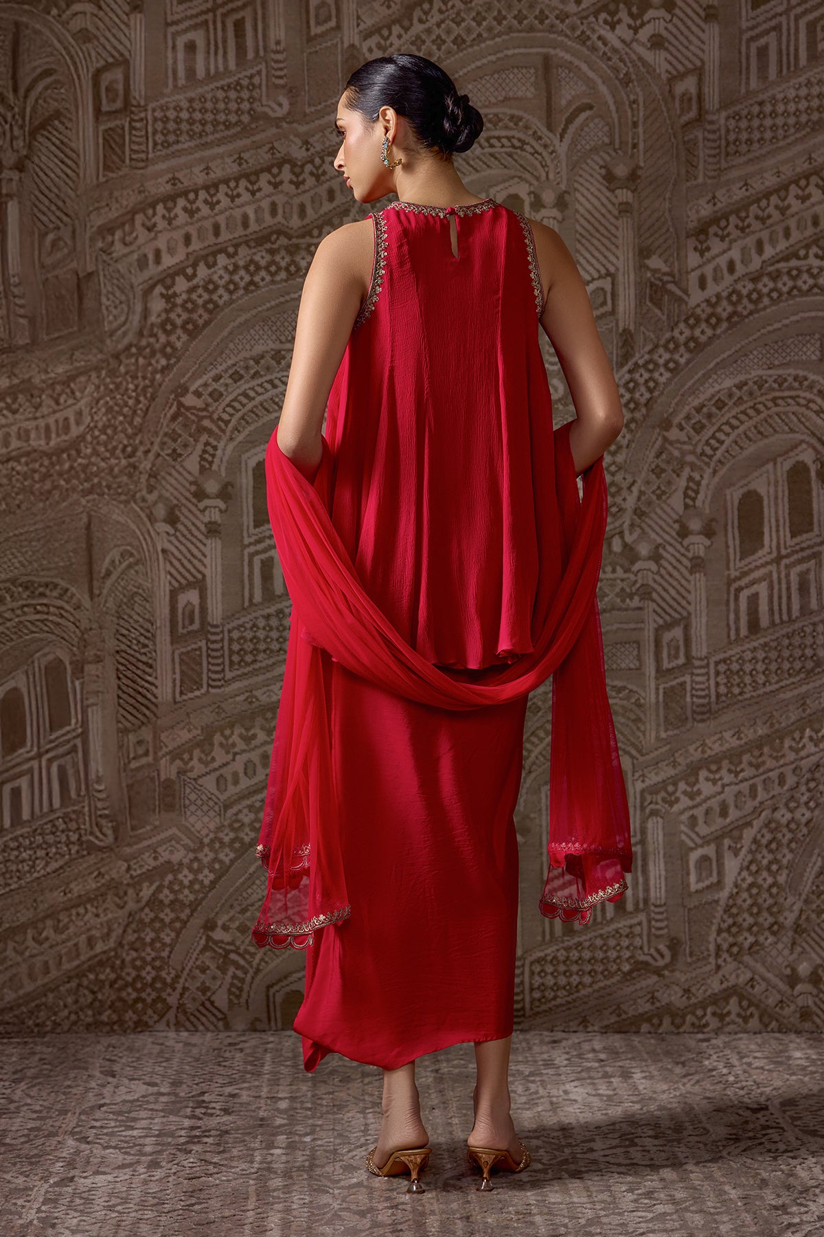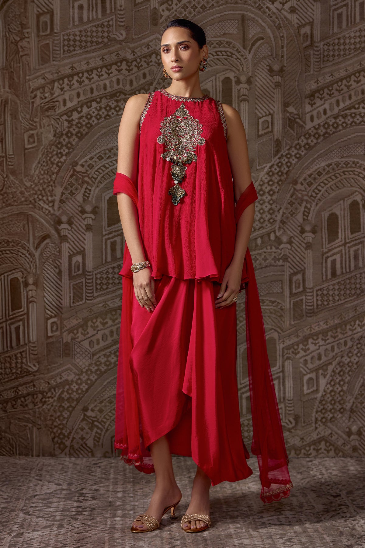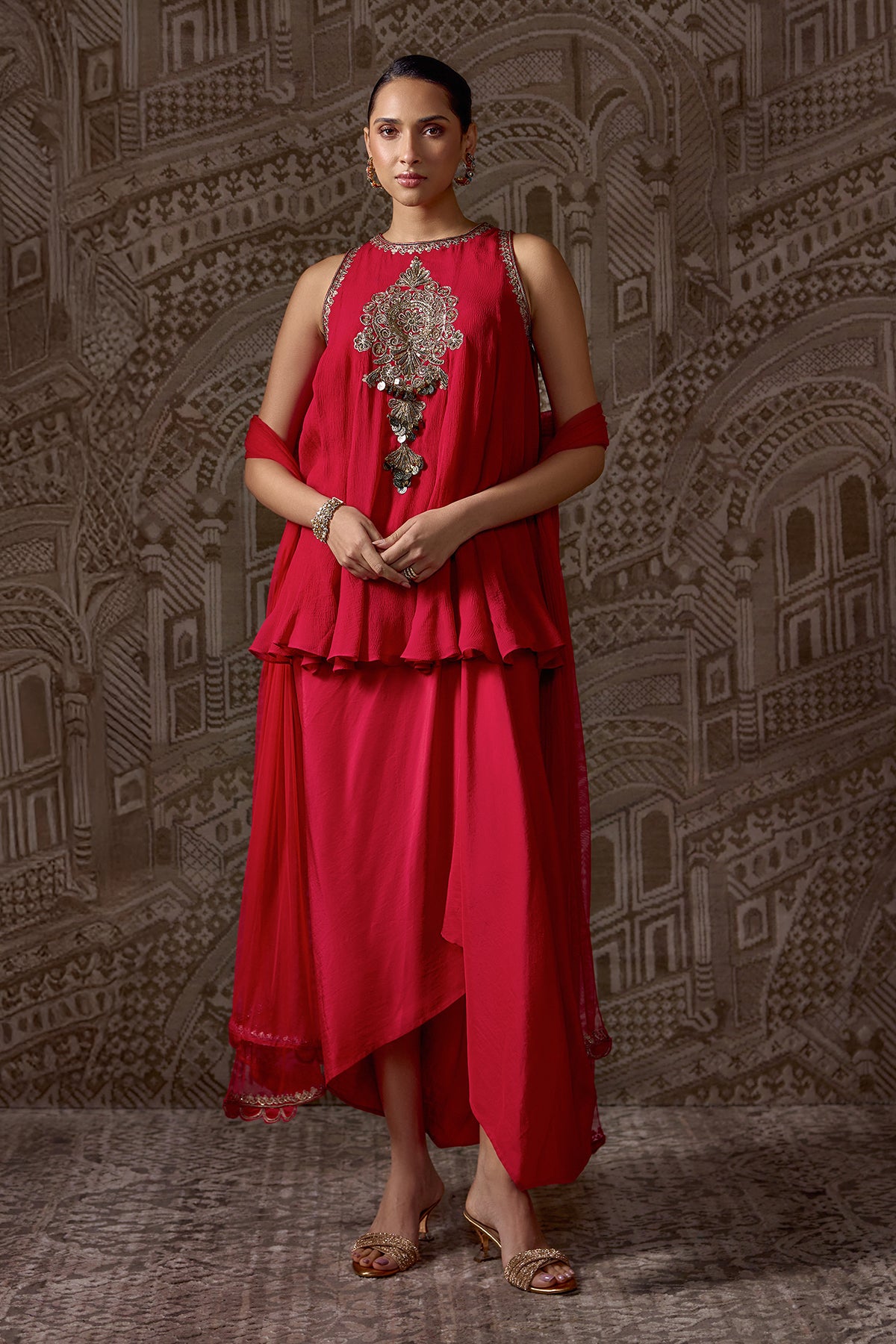 Chiffon Embroidered Short Kurti With Silk Draped Skirt And Net Embroidered Dupatta