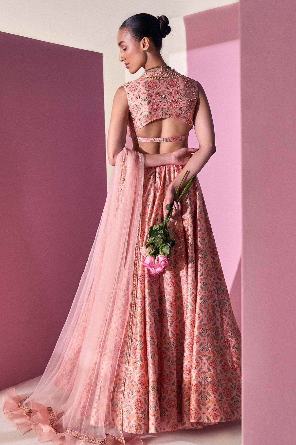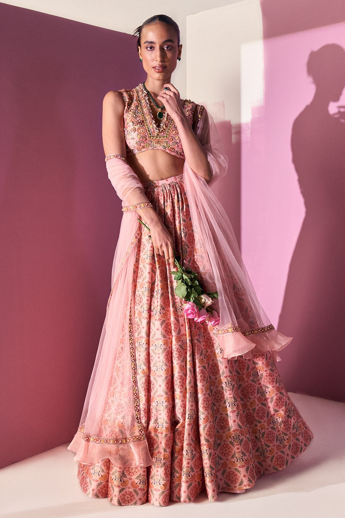 Light Pink Printed Raw Silk Embroidered Blouse Paired Raw Silk Lehenga Paired With Net Embroidered Dupatta