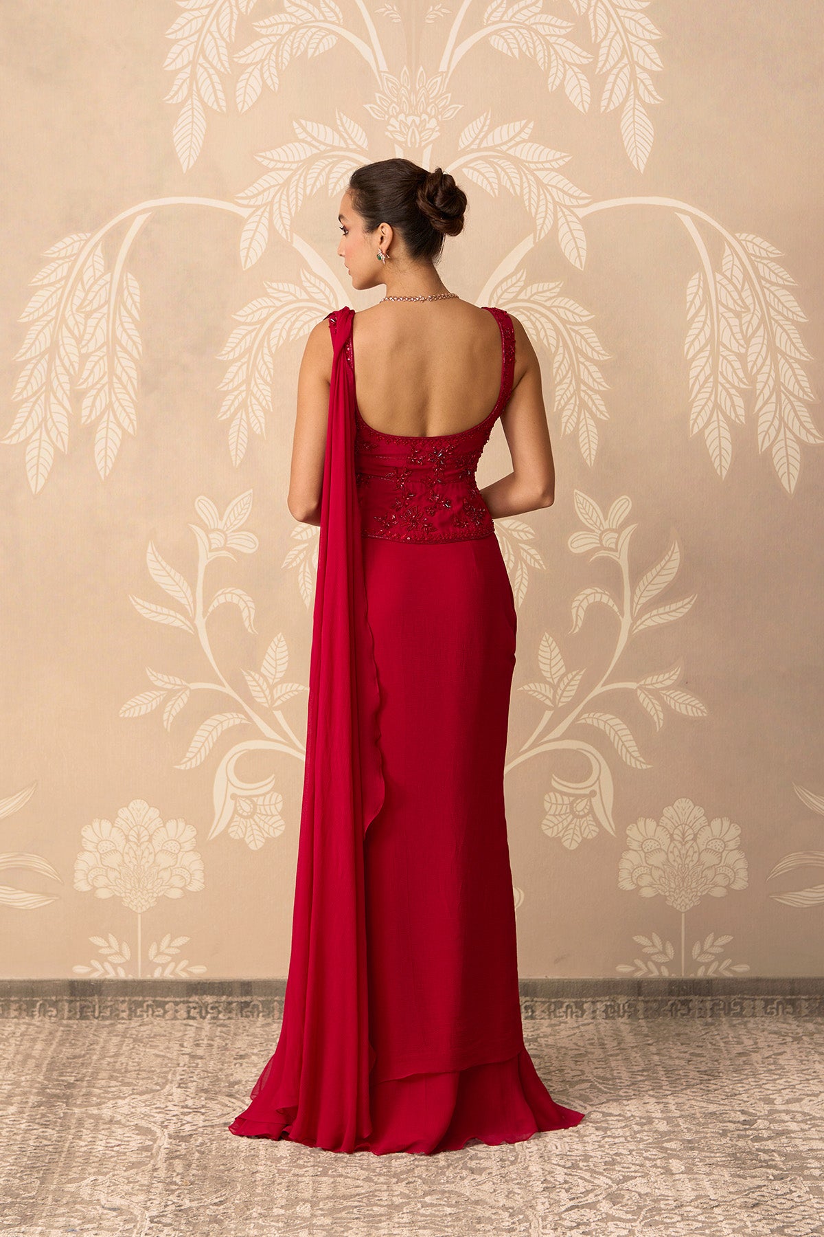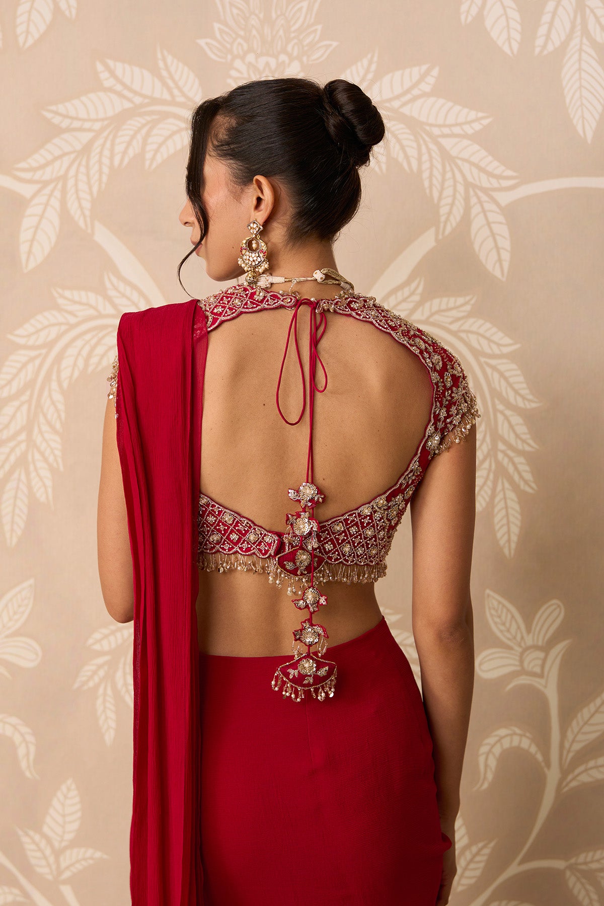 Red Net Embroidered Sleeveless Blouse With Chiffon Drape Saree and Organza Ruffle