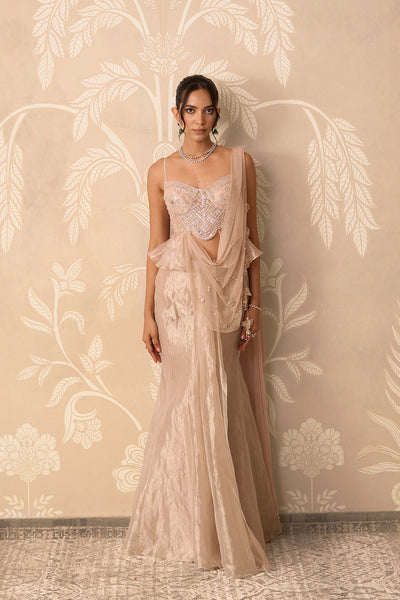 Tissue Embroidered Corset And Saree Skirt Paired With Tissue Embroidered Pallu Dupatta