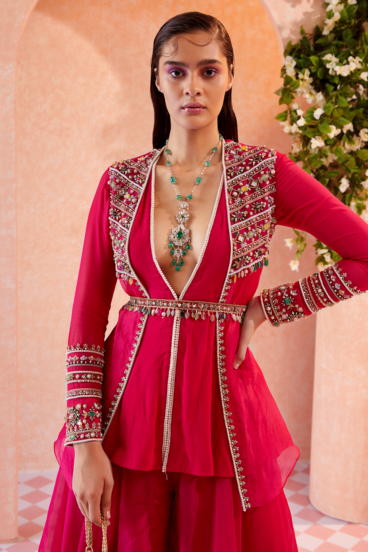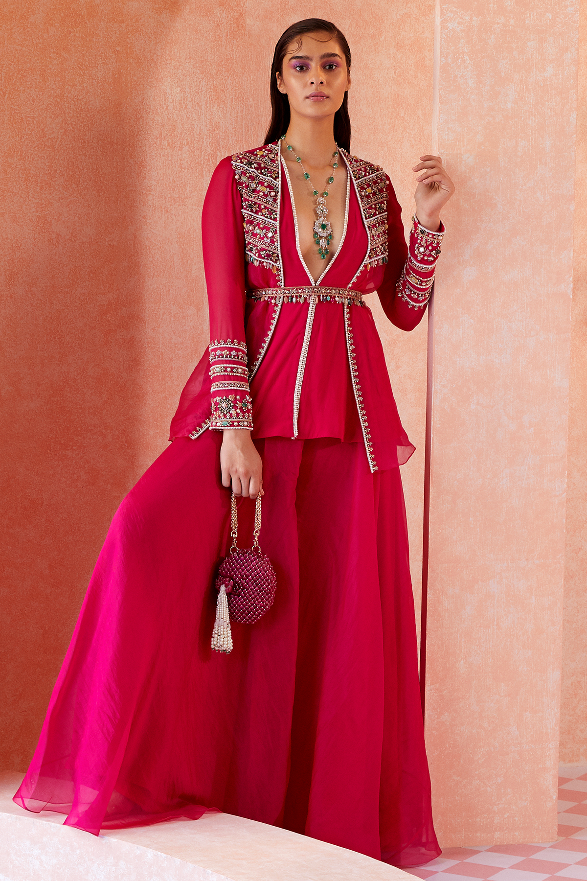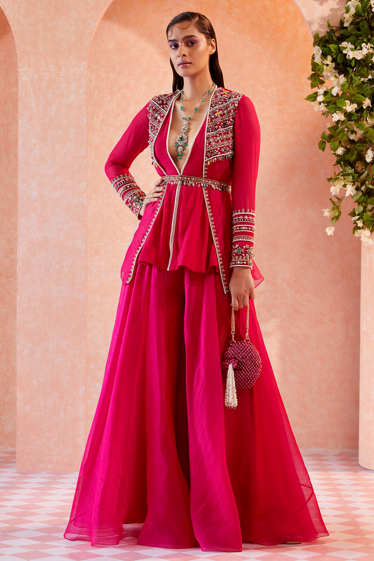 Fuschia Georgette peplum with an organza overlay jacket paired with organza sharara and embellished belt.