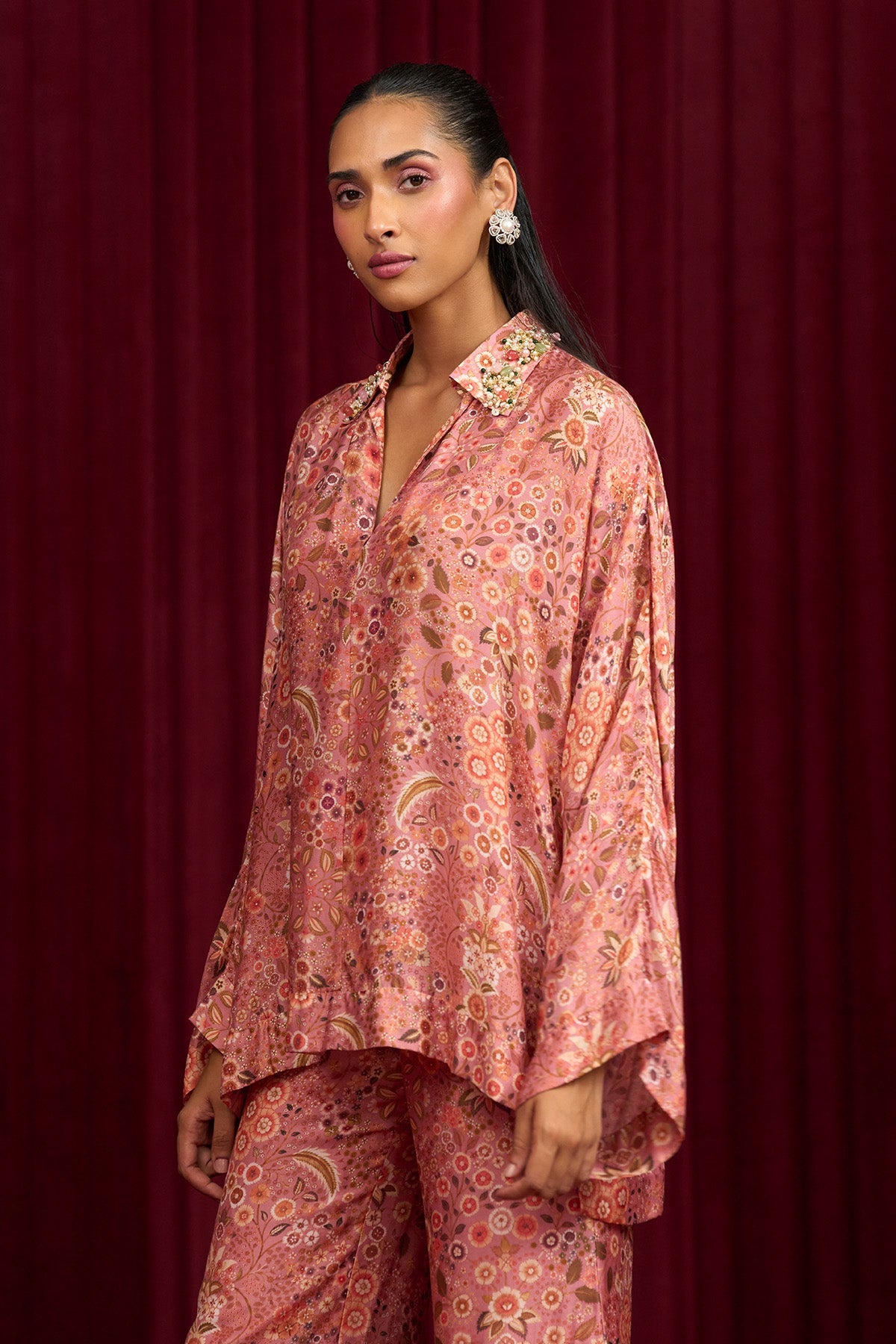 Dusky pink fine silk printed shirt paired with chic flared pants.