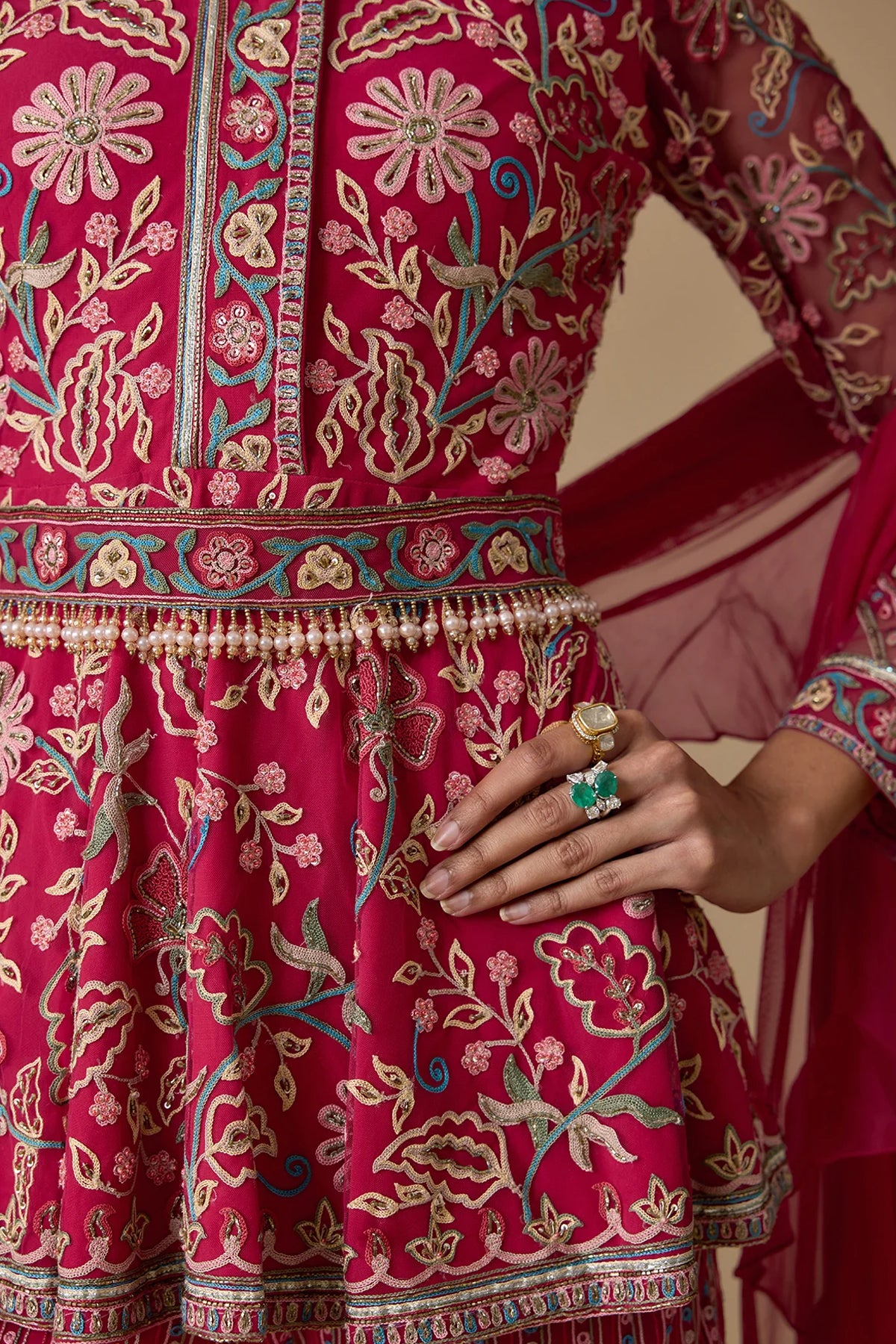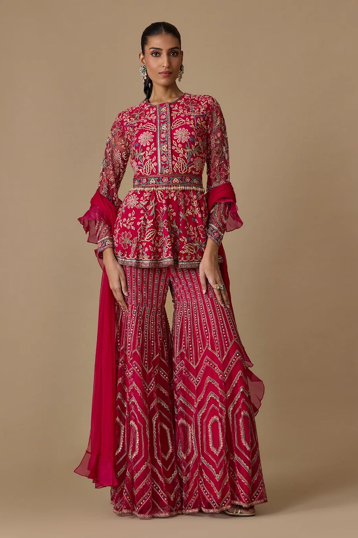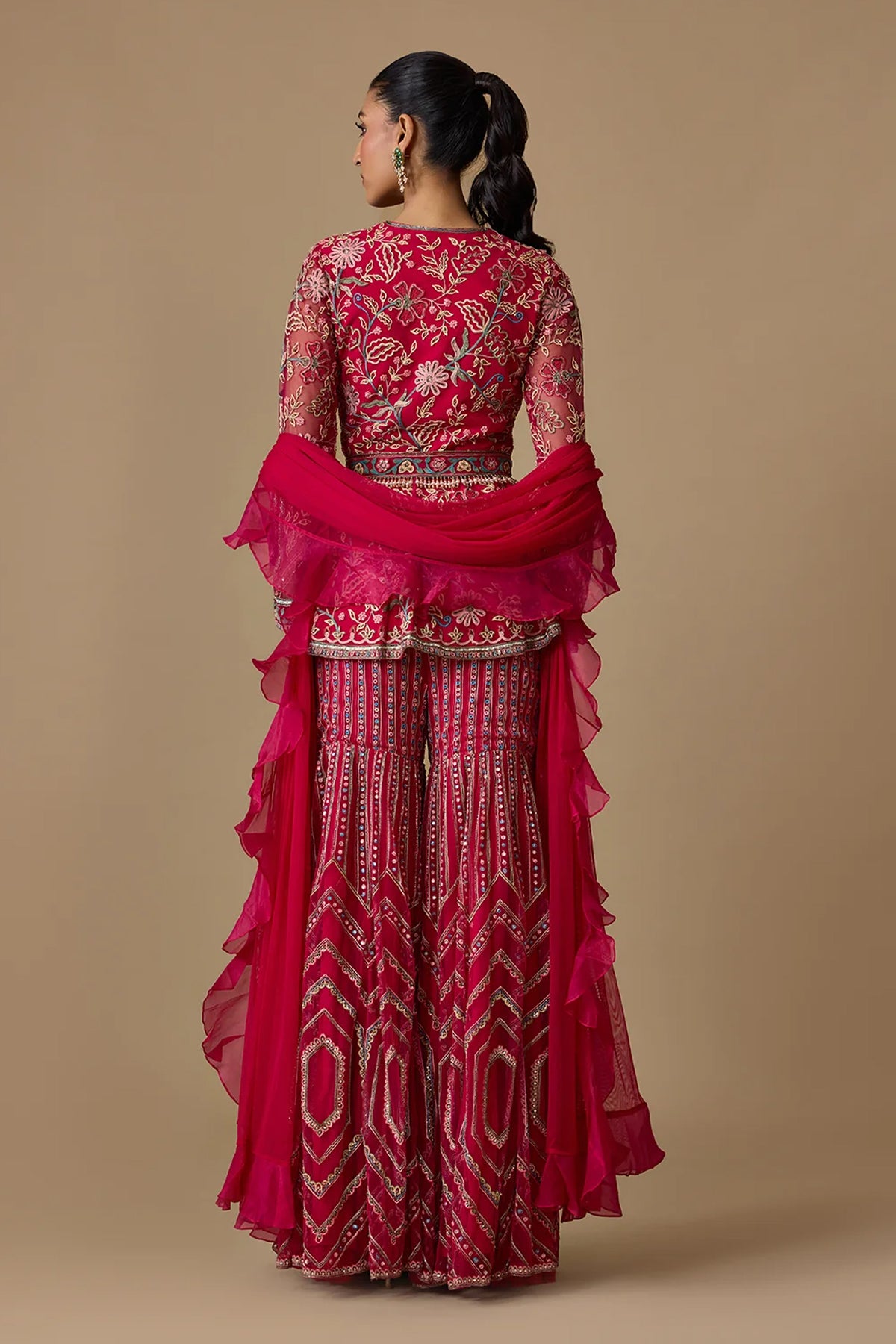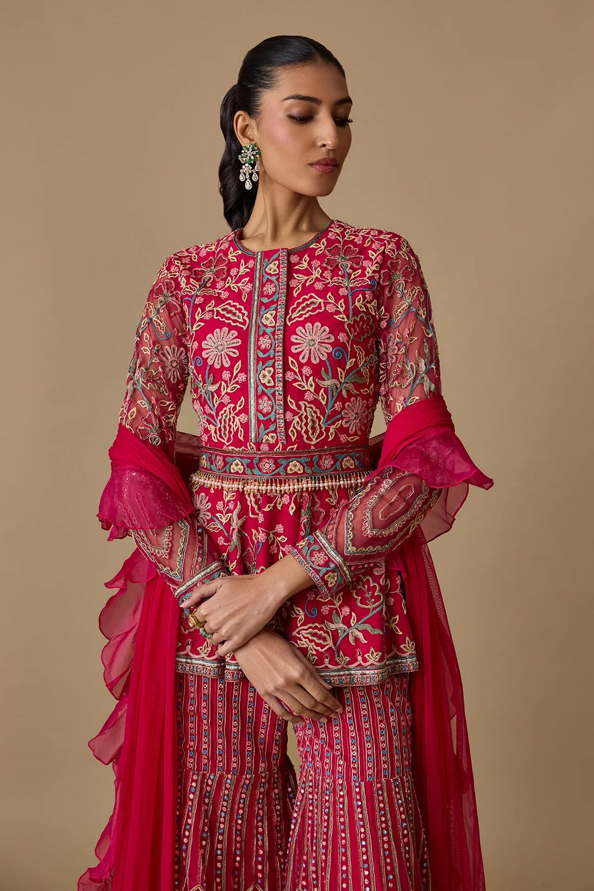 Embroidered net Peplum with embroidered net garara paired with organza frilled net dupatta and embroidered belt