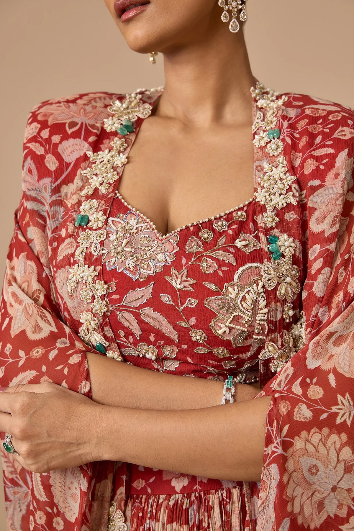 Ivory Printed Chiffon Embroidered Blouse With Printed Chiffon Skirt and Embroidered Cape