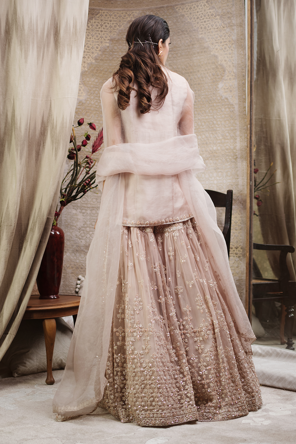 Champagne Embroidered Garara with Short Kurti and Organza Dupatta