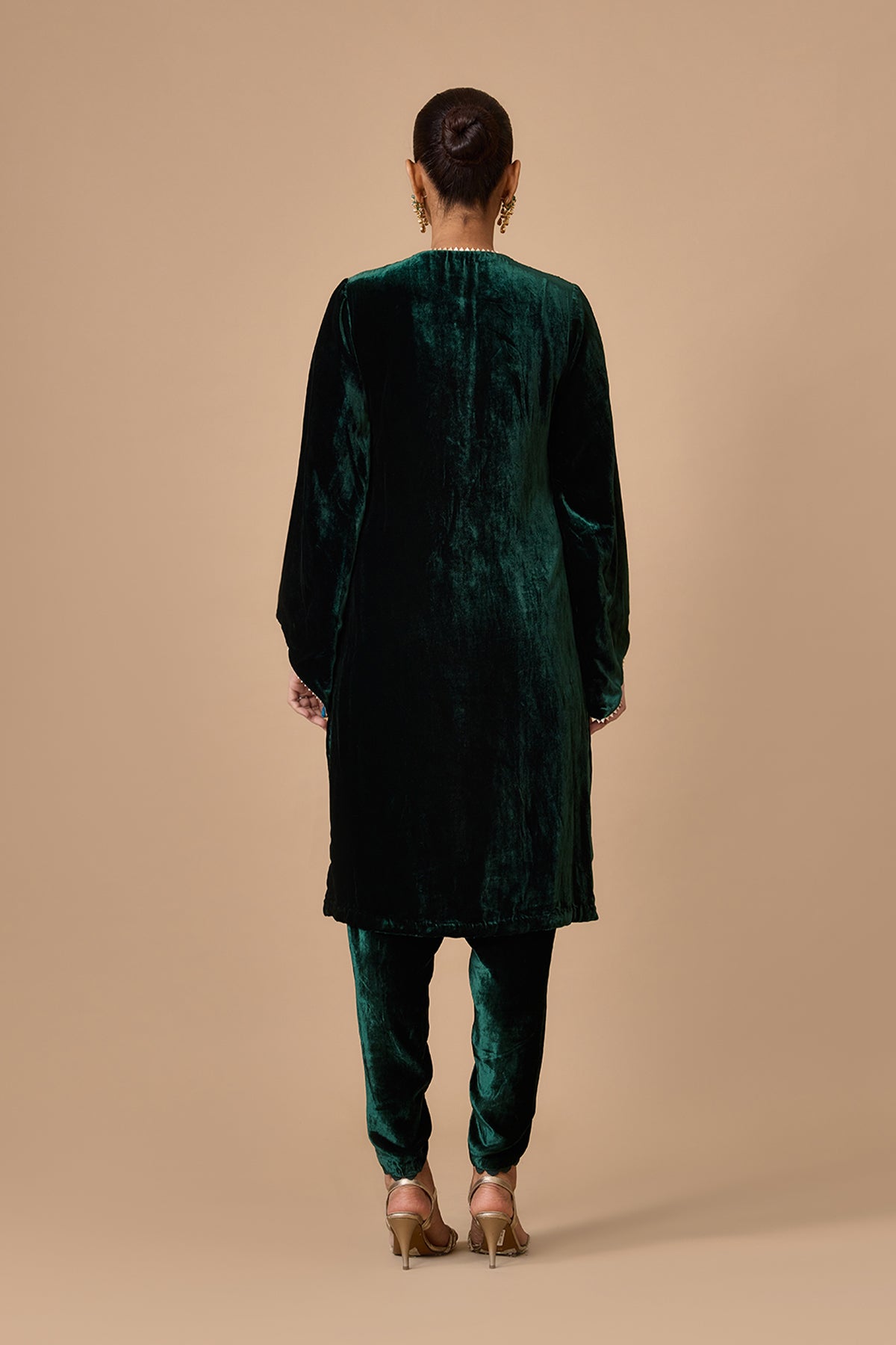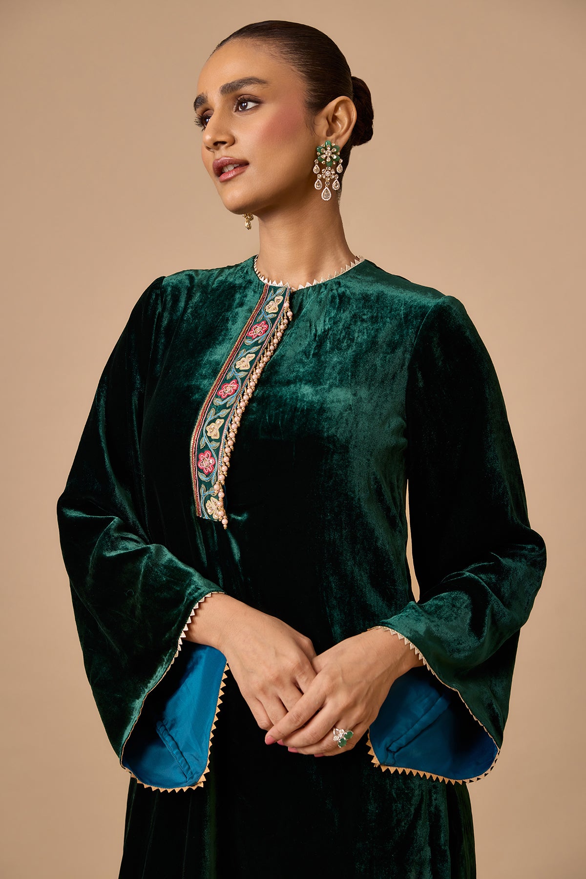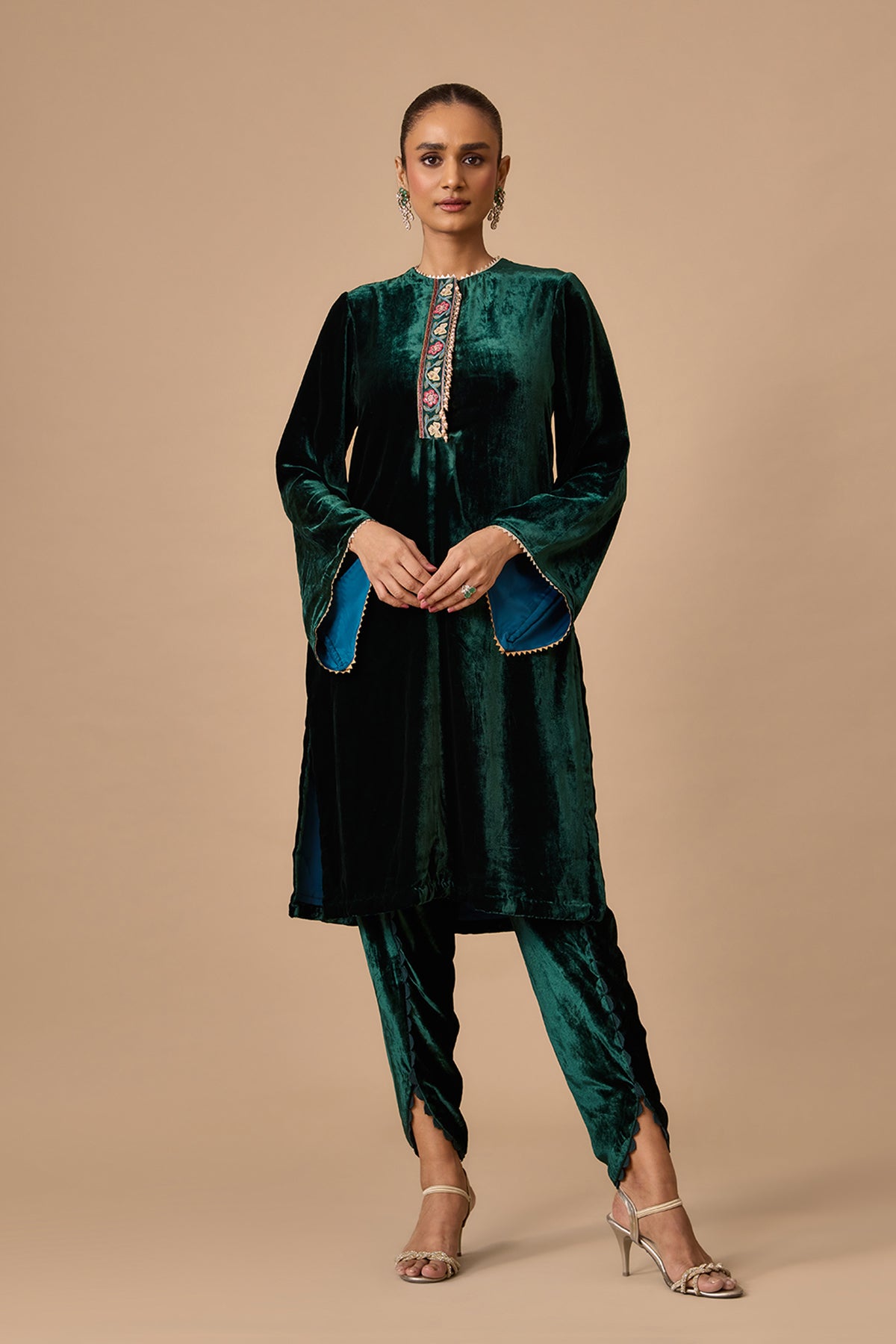 Neck Embroidered Velvet Kurta Paired With A Embroidered Velvet Pant