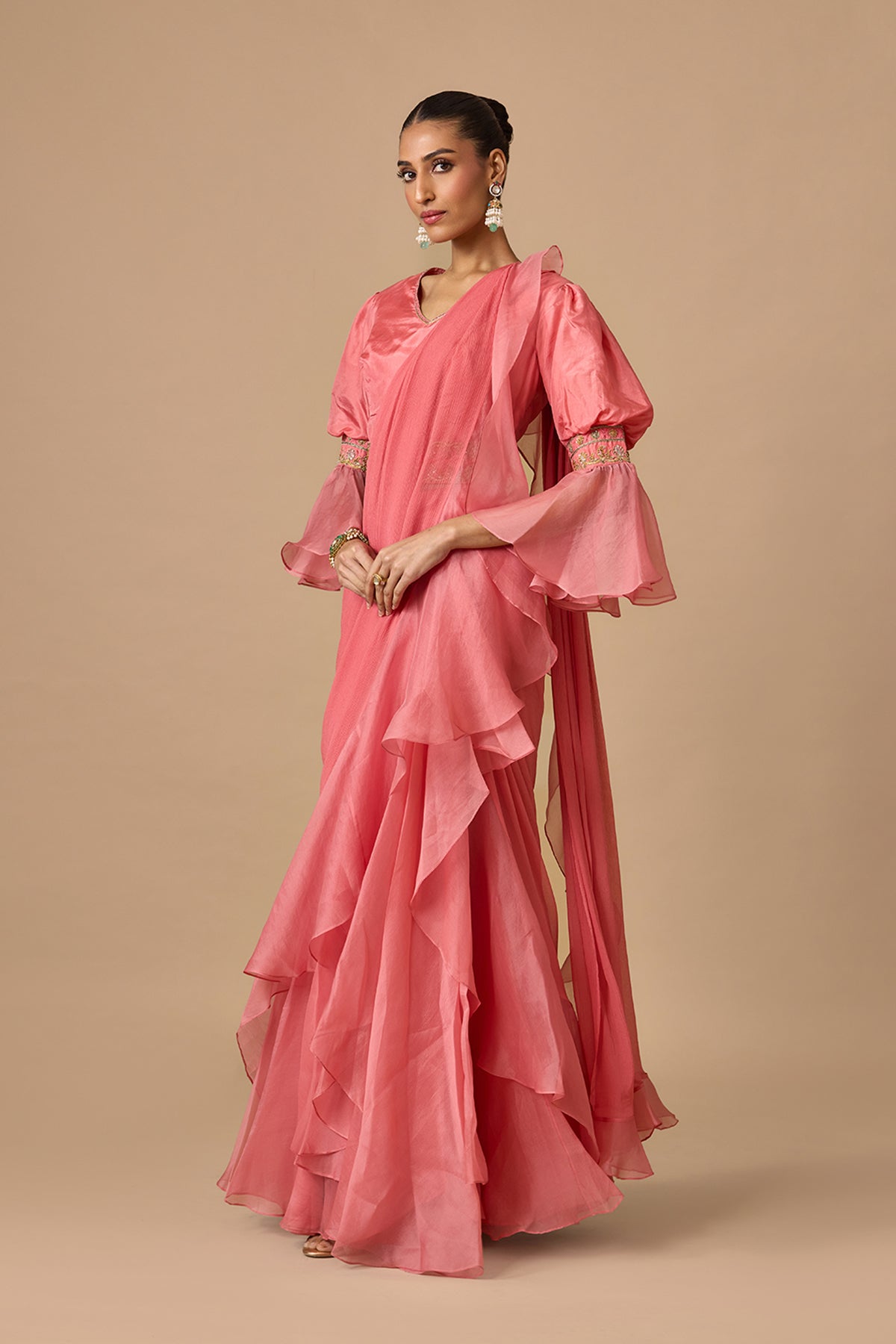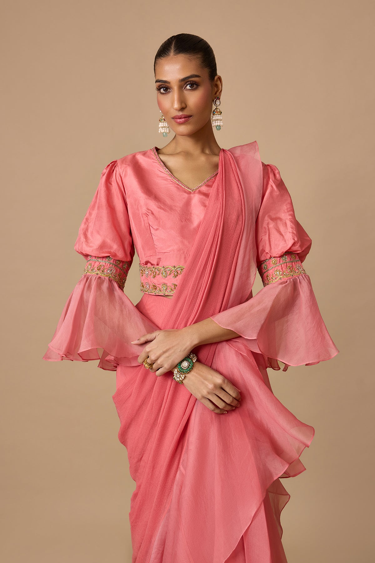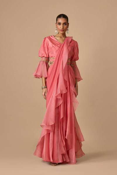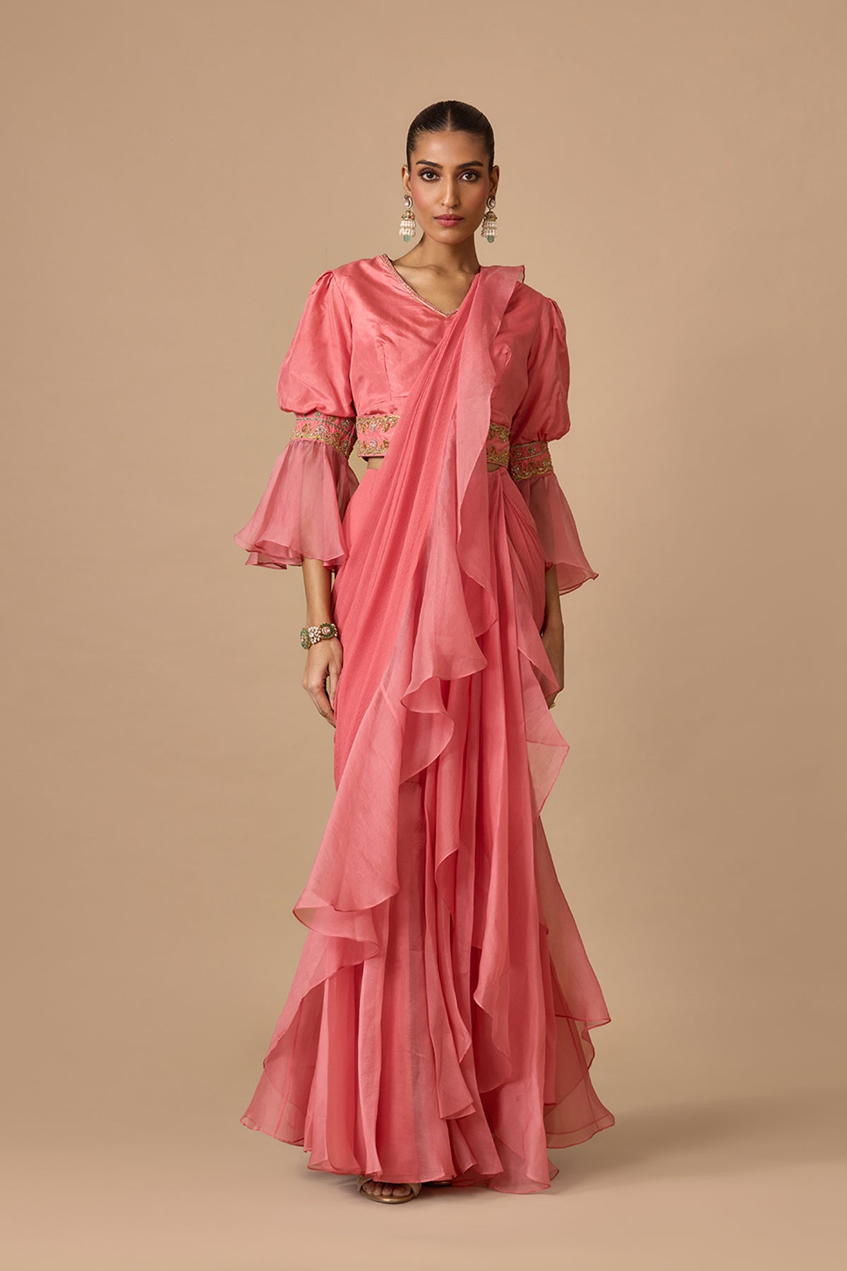 Deep Coral Embroidered Silk Blouse With Attached Belt Paired With Chiffon-Organza Draped Ruffle Saree.
