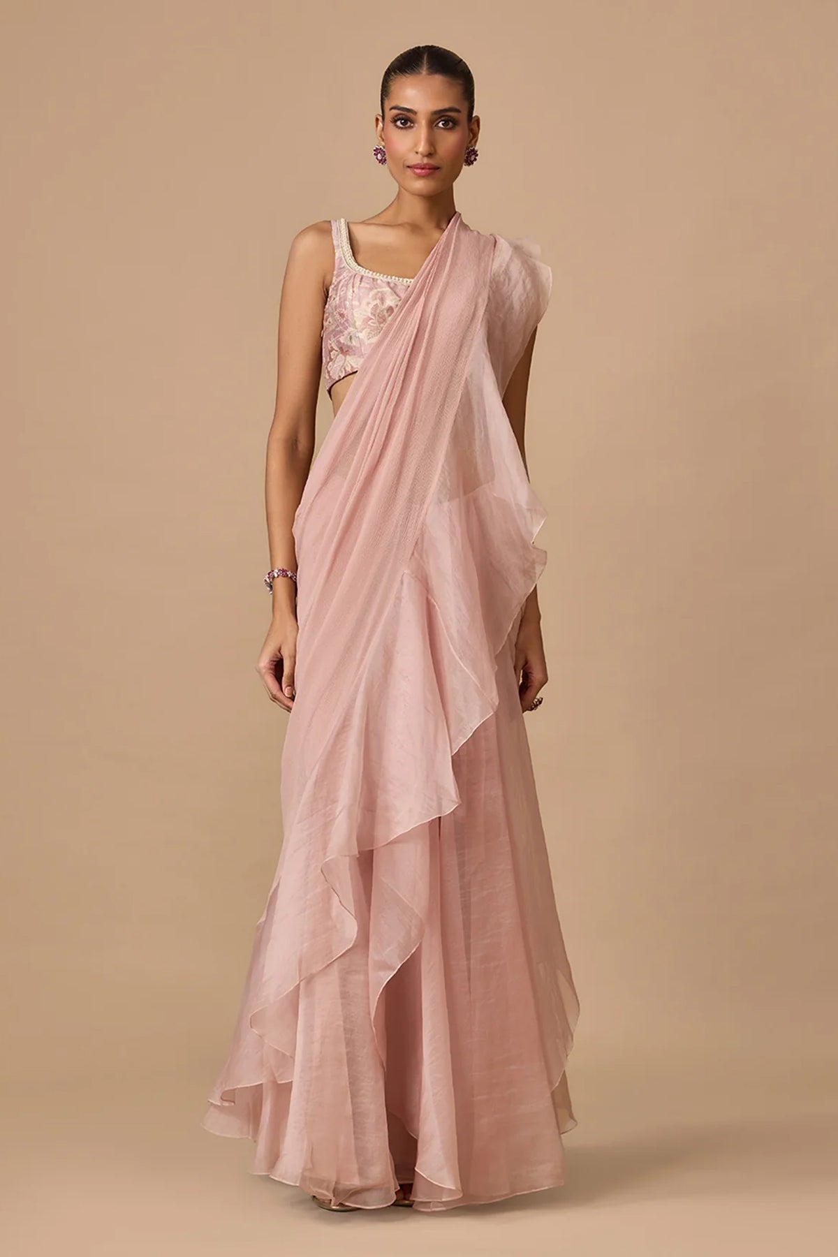 Raw Silk Printed Blouse With Chiffon Pre Draped Saree