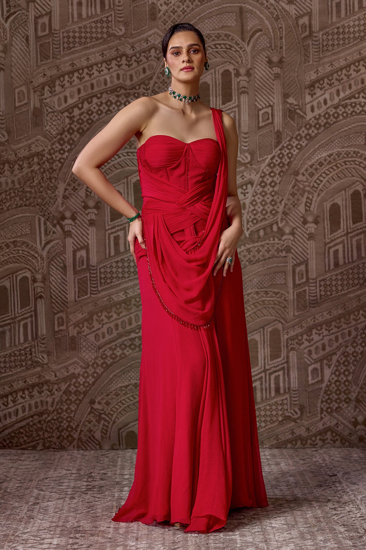 Chiffon Draped Jeweled Embellished Saree Gown