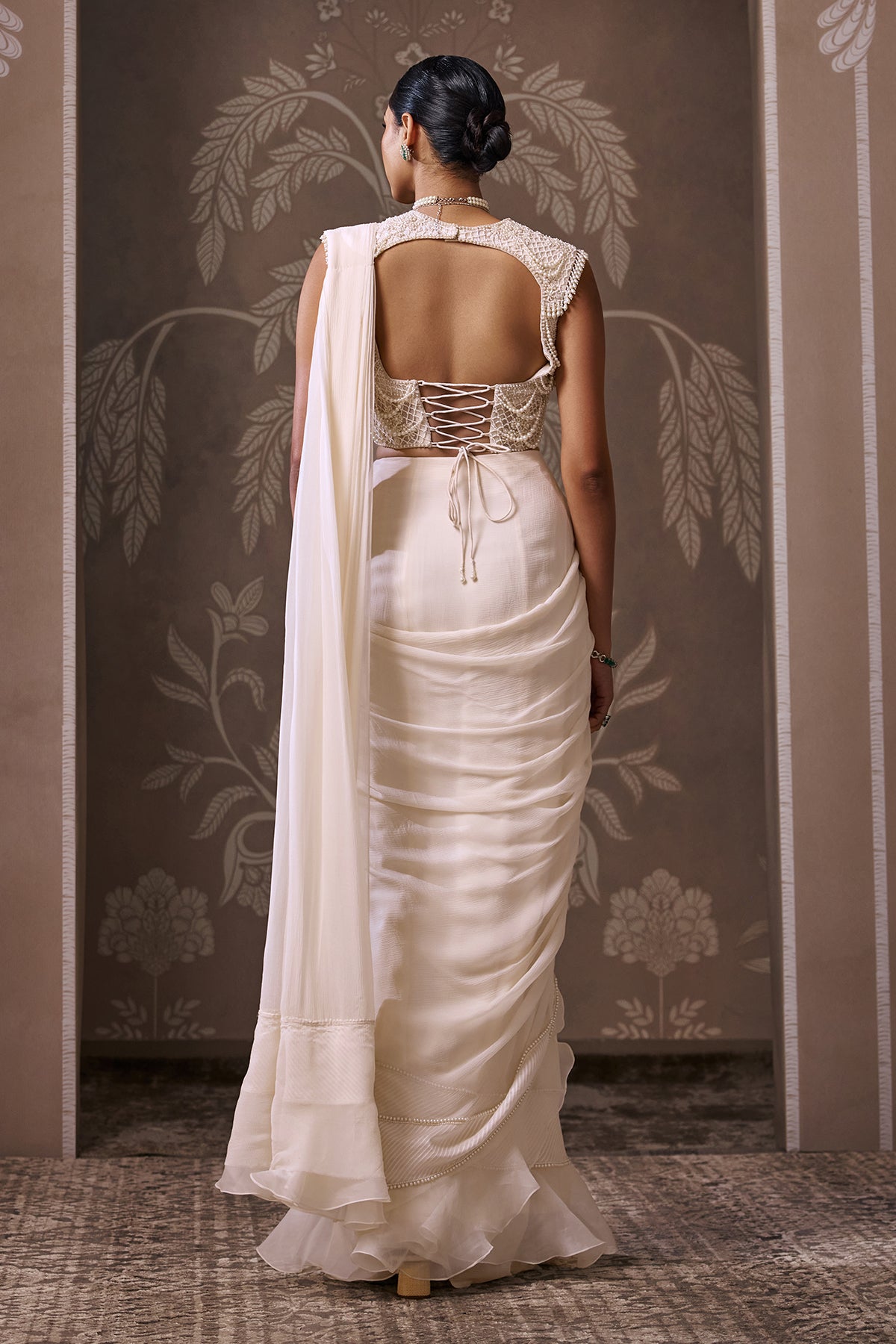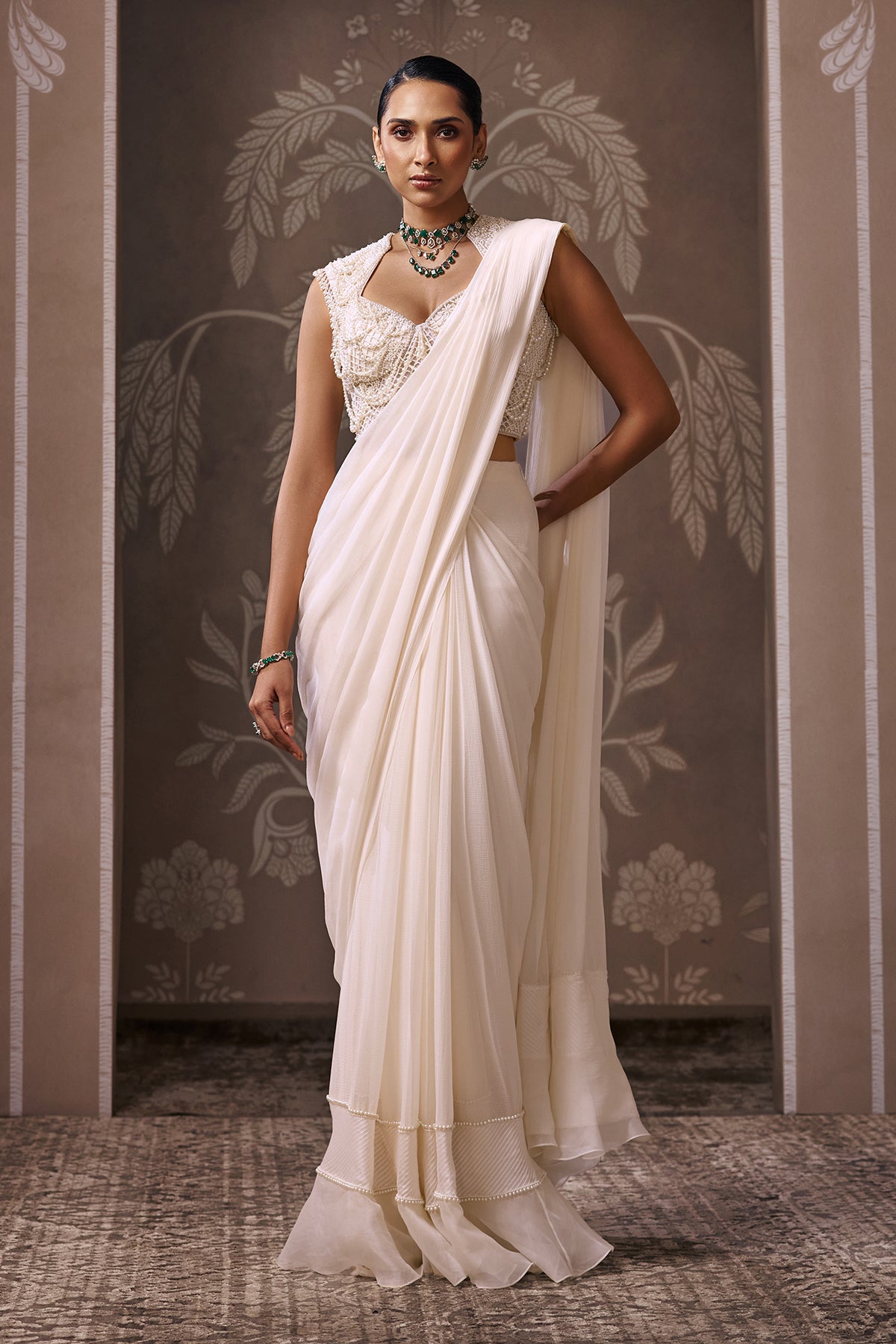 Net Pearl Embroidered Blouse With Chiffon Pre Draped Embroidered Stitched Saree