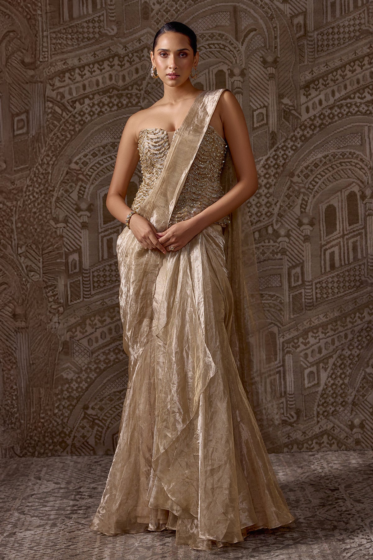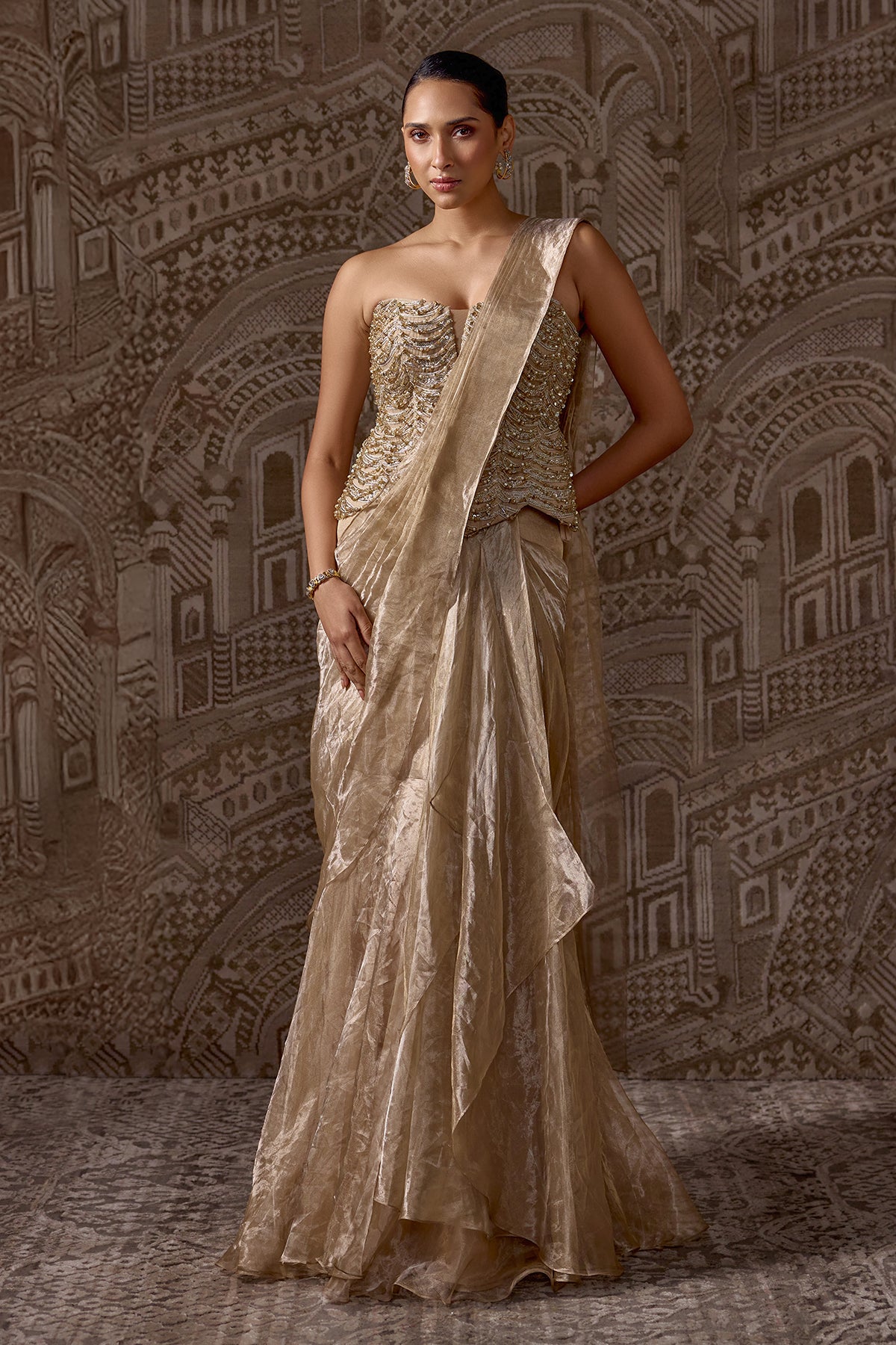 Net Embroidered Corset With Tissue Draped Stitched Saree